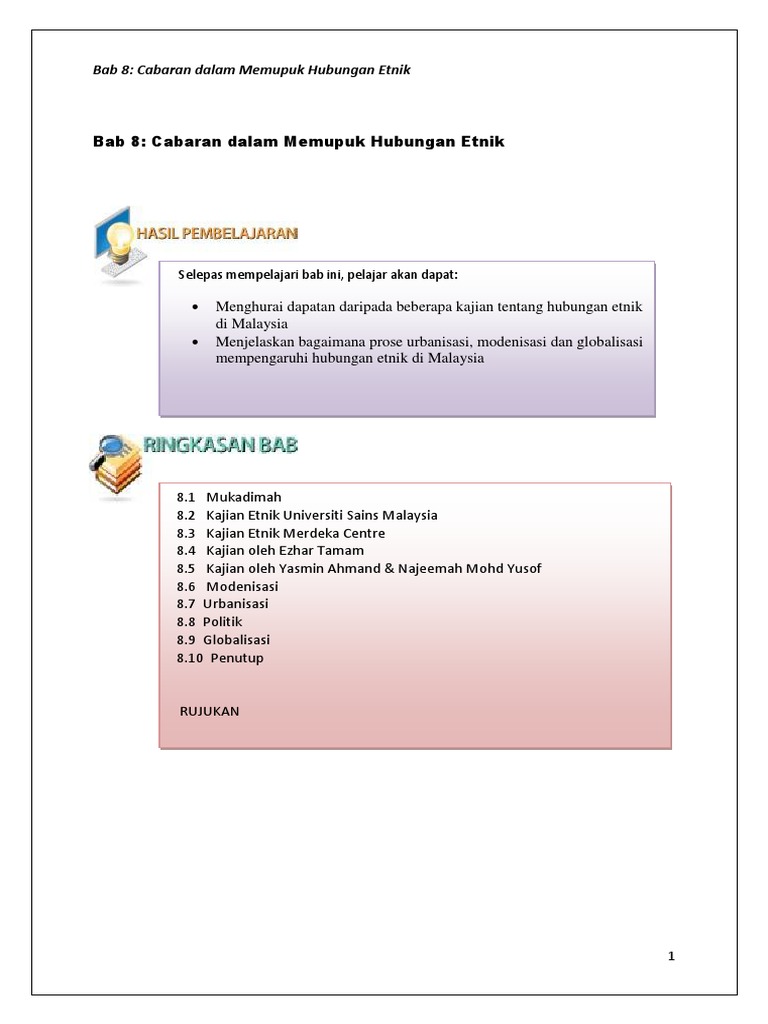 Mengetahui secara lebih jelas skop kemajuan berasaskan islam yang merentasi kepentingan pelbagai etnik di malaysia. Hubungan etnik (mpu3112) jan20 : Selepas mempelajari bab ini, pelajar dapat: Cabaran cabaran dalam mengeratkan hubungan etnik. Pernyataan berikut adalah berkaitan dengan perlembagaan malaysia iaitu merupakan kontrak sosial yang menjadi teras pembentukan negara dan bangsa malaysia kecuali. Menerangkan tahap hubungan etnik di malaysia. Pemupukan nilai nilai murni antara etnik di malaysia melalui dasar kebudayaan kebangsaan ayu nor azilah mohamad1 2rohaini amin 3nor azlina endut kolej universiti islam antarabangsa selangor abstrak kita berasa bertuah dilahirkan di negara. Persaudaraan 6 hubungan etnik merupakan perkara yang sangat penting bagi masyarakat majmuk di malaysia. Group assignment hubungan etnik : Timbul rasa tidak puas hati dalam kalangan etnik. Kepentingan pendidikan dalam hubungan etnik. Antara cabaran dalam memupuk dan membina jati diri bangsa malaysia ini adalah berlakunya peristiwa 13 mei 1969. Perpaduan antara kaum akan menjadikan.