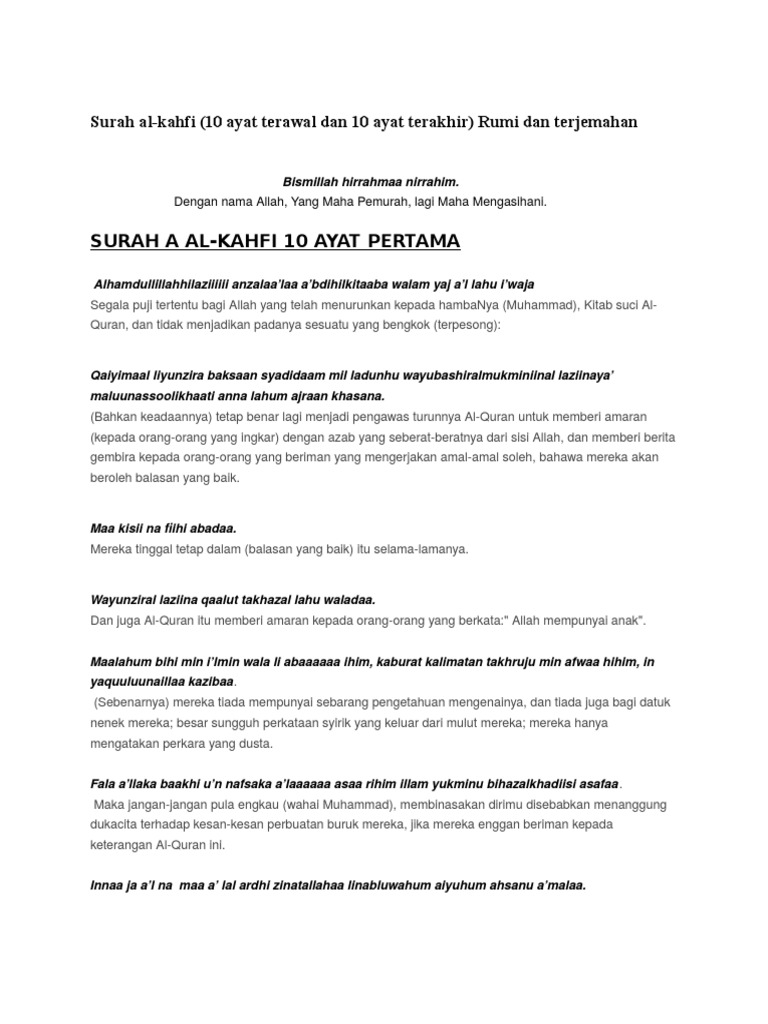 Bacaan surah al kahfi 1 10 rumi rumi. Terjemahan al quran bahasa melayu. Alhamdu lillaahil lazeee anzala 'alaa 'abdihil kitaaba wa lam yaj'al lahoo 'iwajaa; Edited from the full version of al kahfi recited by muzammil hasbullah. Ma kithi nafi hi abada.